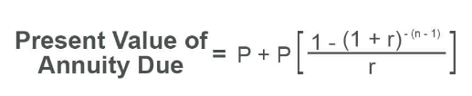 Remember that this formula assumes that the payments occur at the beginning of each period. If the payments were made at the end of each period, you would use a slightly different formula. Further please note that if annuity is increase at a certain percentage at each period then in above formula, in nominator “(1+r)^-(n-1)” is relaced by “(1+g)^(n-1)/(1+r)^(n-1) ” and in denominator r is replaced by (r-g) where g is the growth rate of annuity.