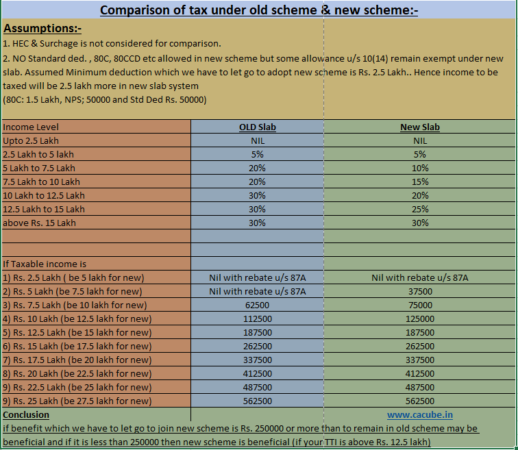 (8) Hence assessee is required to choose between old & new slab rates. Different decision may be useful for different assessees. Before taking any decision assessee should calculate his tax liability under both the options predicting his approximate income and then he has to choose the option in which his tax liability is less. A basic comparison of OLD & NEW tax regime is given here:-